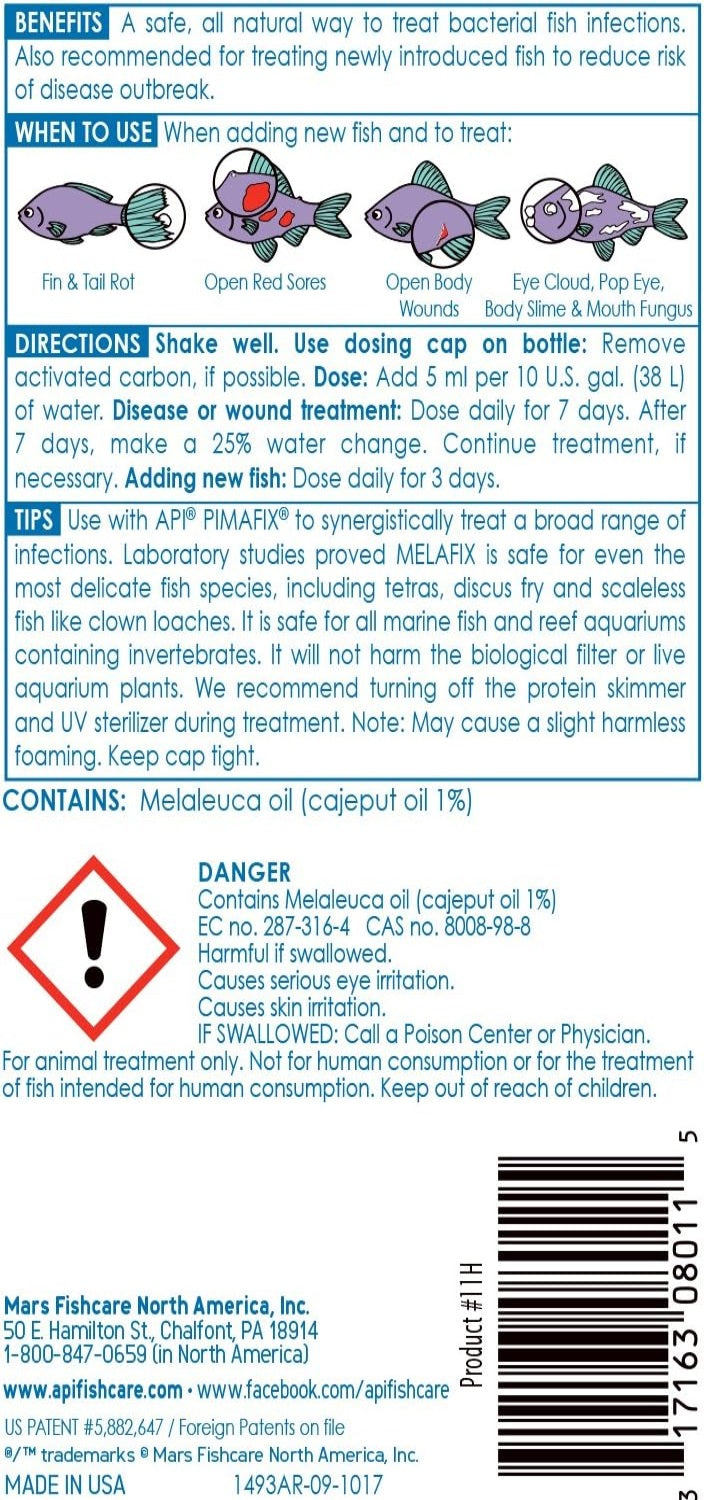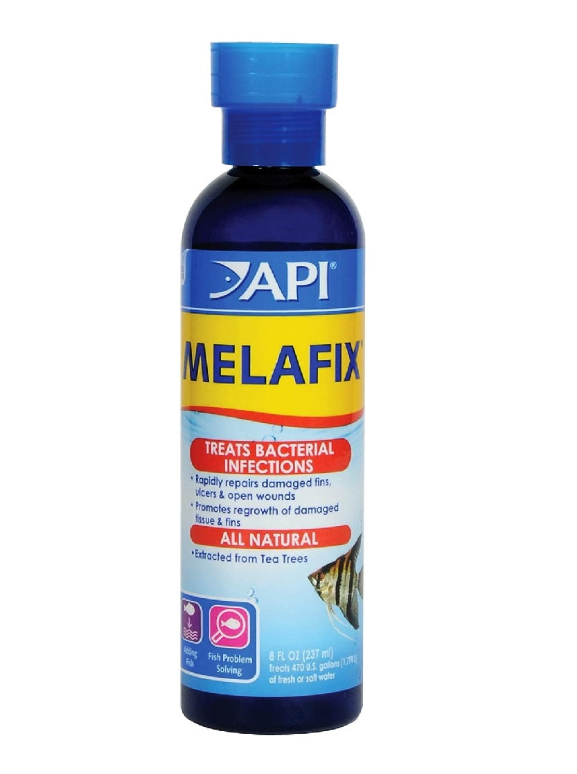 - API MELAFIX fish remedy is an all-natural antibacterial treatment that works to treat infections in fish. Common bacterial infections are open wounds and abrasions, tail rot, eye cloud, and mouth fungus.