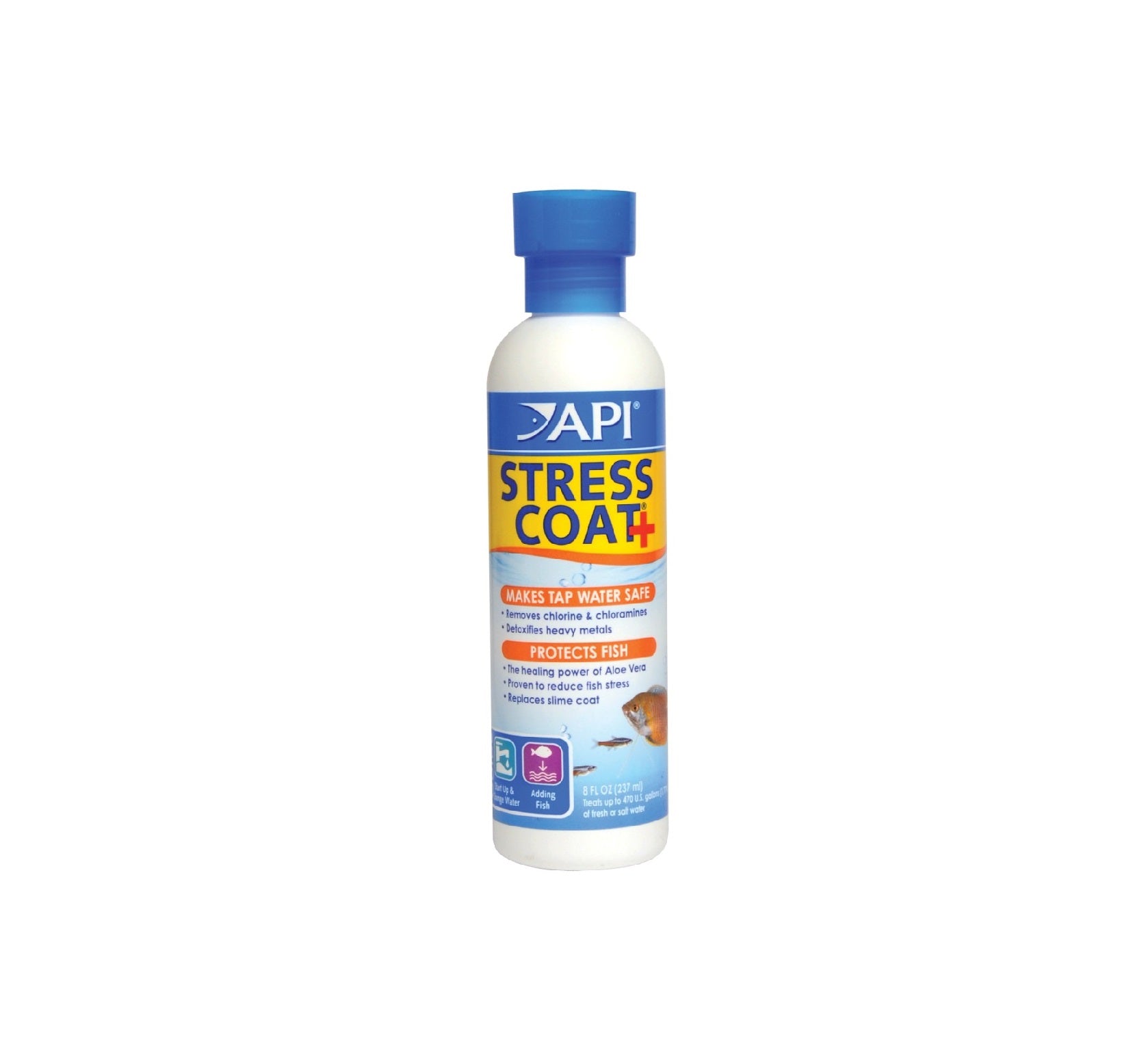 API® STRESS COAT water conditioner makes tap water safe for fish by removing chlorine, chloramines and heavy metals from tap water, and contains the healing power of Aloe Vera to reduce fish stress by up to 40% and to heal damaged tissue and wounds.