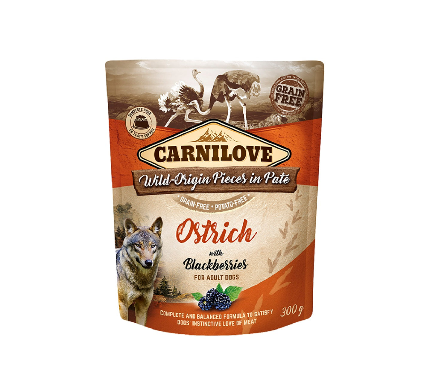 Hypoallergenic and highly digestible ostrich meat to promote digestive tract health. Low content of fat and cholesterol supports optimal condition, heart health, and the circulatory system. Blackberries are rich in antioxidants and help maintain skin and urinary system health.