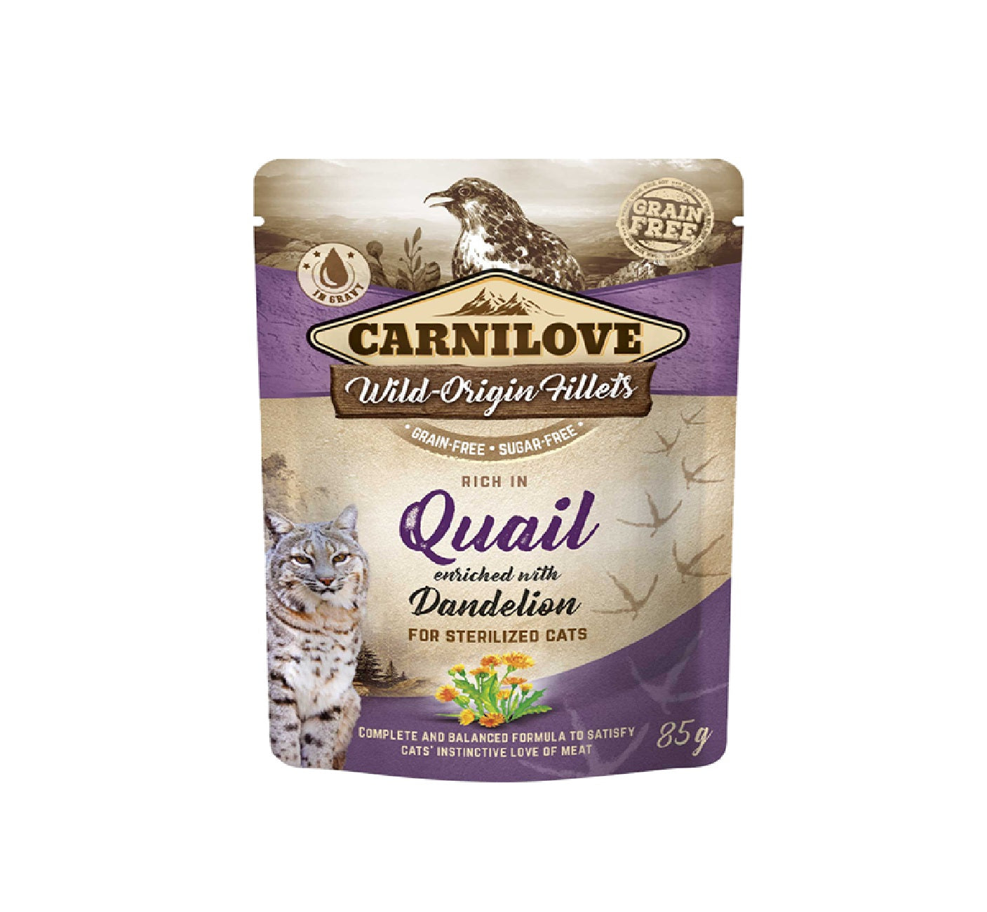 Hypoallergenic and highly digestible quail meat. The high content of polyunsaturated fatty acids protects the heart and circulatory system. High levels of selenium shield cells from oxidative stress, which helps improve the quality of the skin, joints, and brain. Because dandelion is rich in antioxidants, it has anti-inflammatory properties and supports healthy skin, heart, urinary system, and gums. It reduces cholesterol levels in the blood, which helps protect the heart and circulatory system, and it also reduces blood glucose levels.