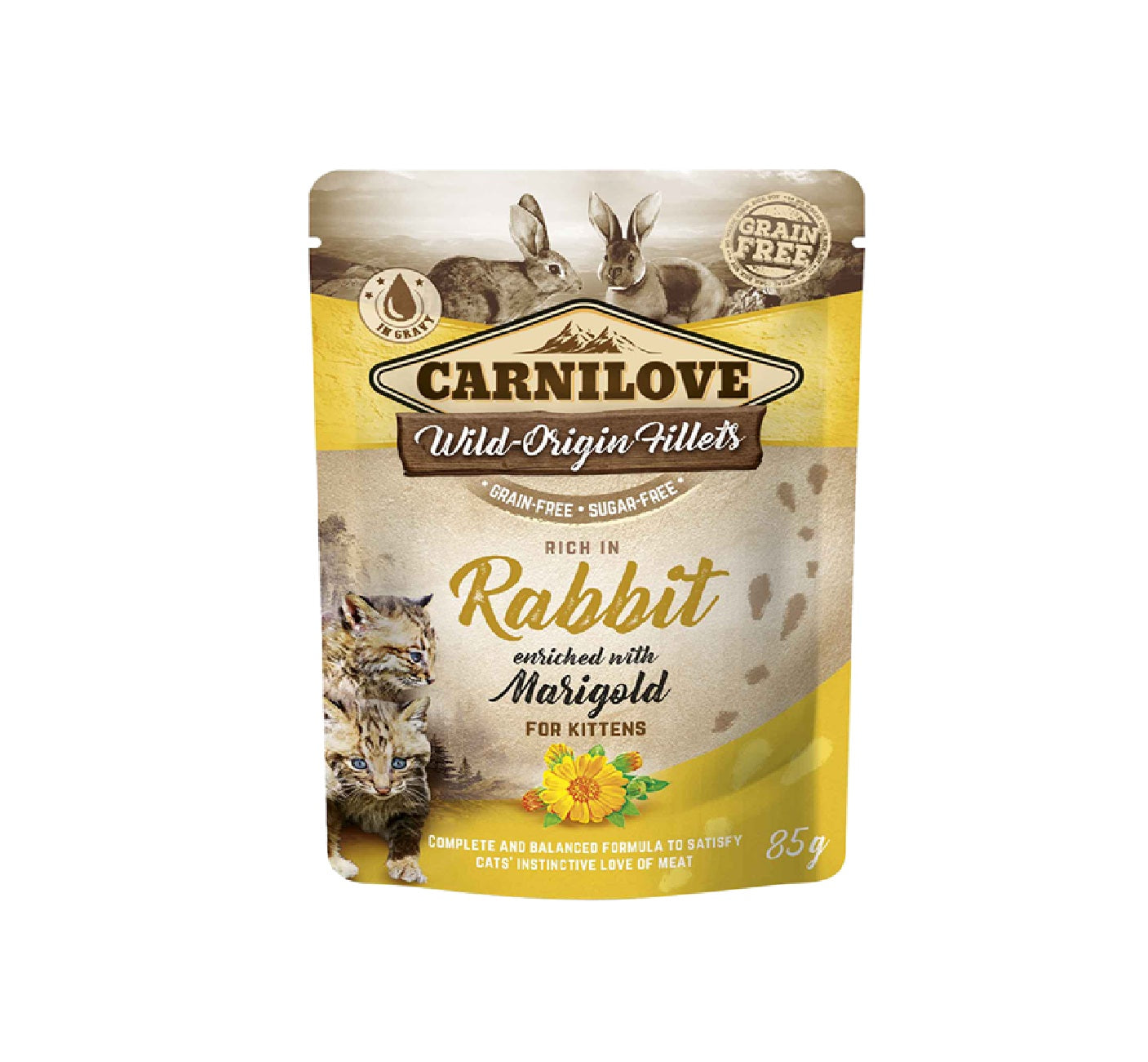 COMPOSITION: 85% meat in fillets (71% chicken, 14% rabbit), 12% broth, 1% marigold, 1% linseed oil, 0.5% minerals, 0.5% vegetable starch.