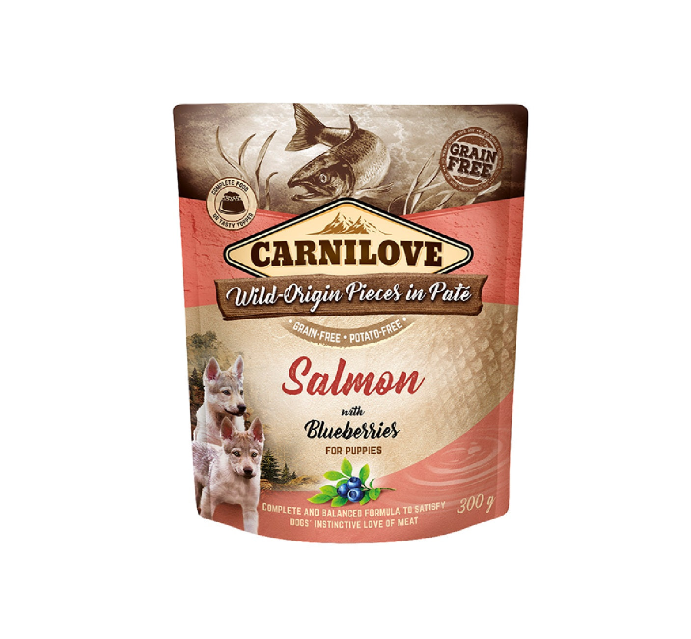 Highly digestible and nutritious salmon supports digestive tract health and optimal condition. Omega-3 fatty acids support the skin, heart, brain, and joints and promote healthy physical development. The properties of blueberries protect against urinary tract infections and also support brain development and function.