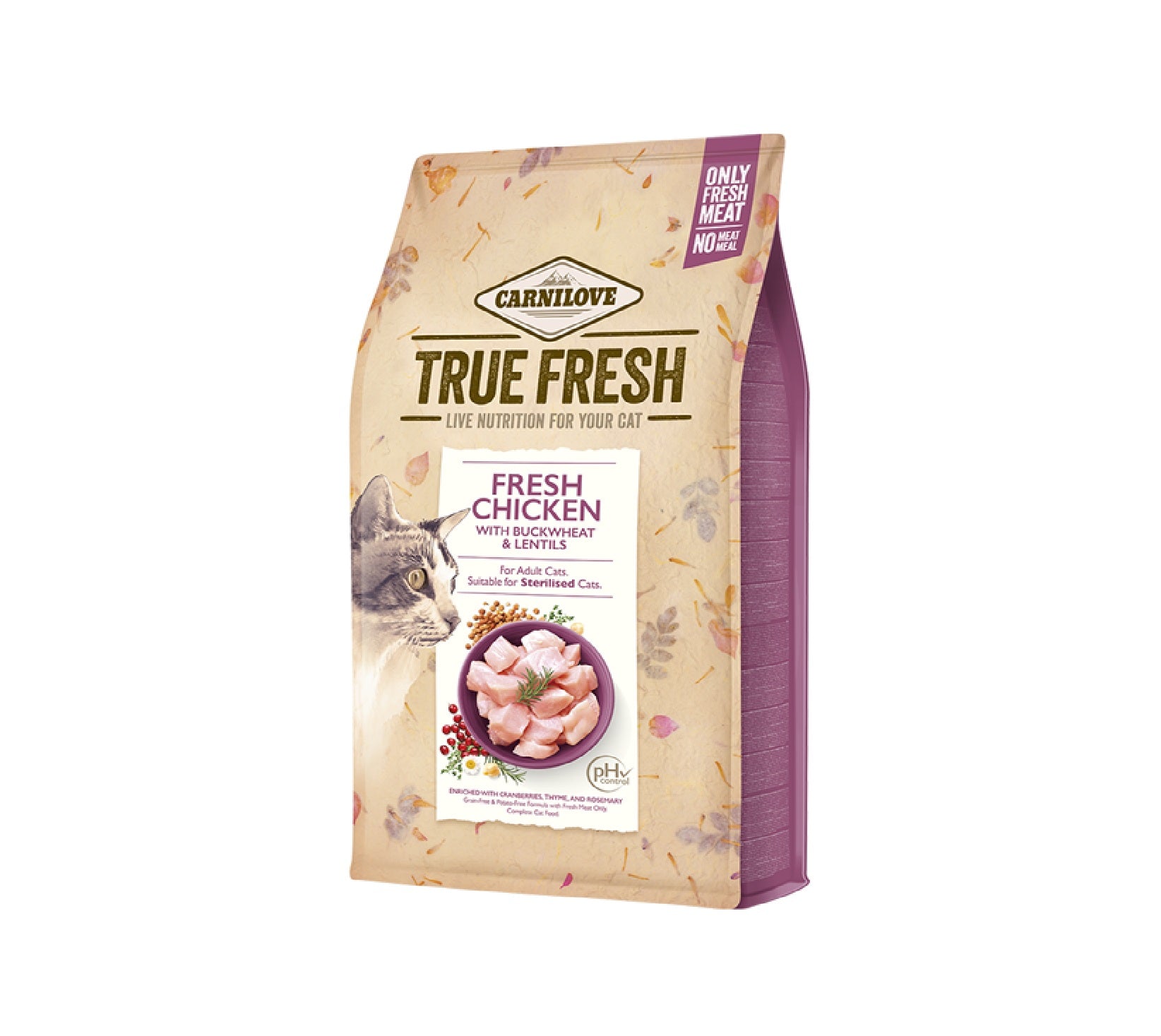 The formula contains a high proportion of fresh turkey from farms and local sources. The unique production method preserves the original properties of the ingredients for an entirely new and delicious sensory experience that satisfies cats’ natural instincts. Because the meat is processed fresh, true fresh provides excellent taste, digestibility, and a more natural form of nutrition. Buckwheat, peas, and lentils are natural sources of vegetable protein and the minerals required for healthy metabolism, and they help maintain optimum body weight. Peas and red lentils are excellent sources of dietary fibre and have a low glycaemic index, which means blood sugar increases slowly after a meal. -Fresh chicken – an excellent source of amino acids with limited amount of fat – great for building muscles and promoting strong immunity -Cranberries, sea buckthorn, and blueberries help to keep optimal urinary pH and healthy urinary tract -Antioxidants in cranberries, sea buckthorn, blueberries, and lemna improve various immune functions and help to protect the body from infections.