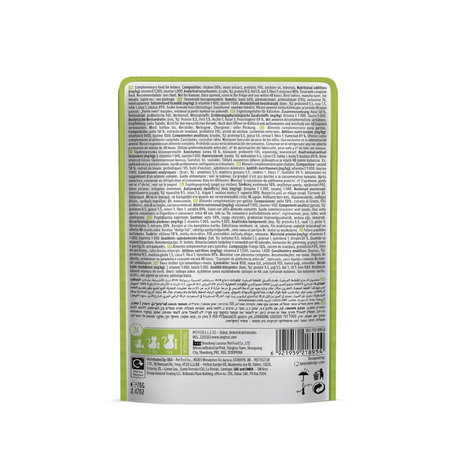 Feed with complete food. Ideal for daily supplementary feeding of kittens of all breeds. Up to 3 pouches per day. Serve at room temperature. Always have fresh water in a bowl. Shelf life 36 month if stored properly. Store in a cool and dry place. Best before date indicated on the package.