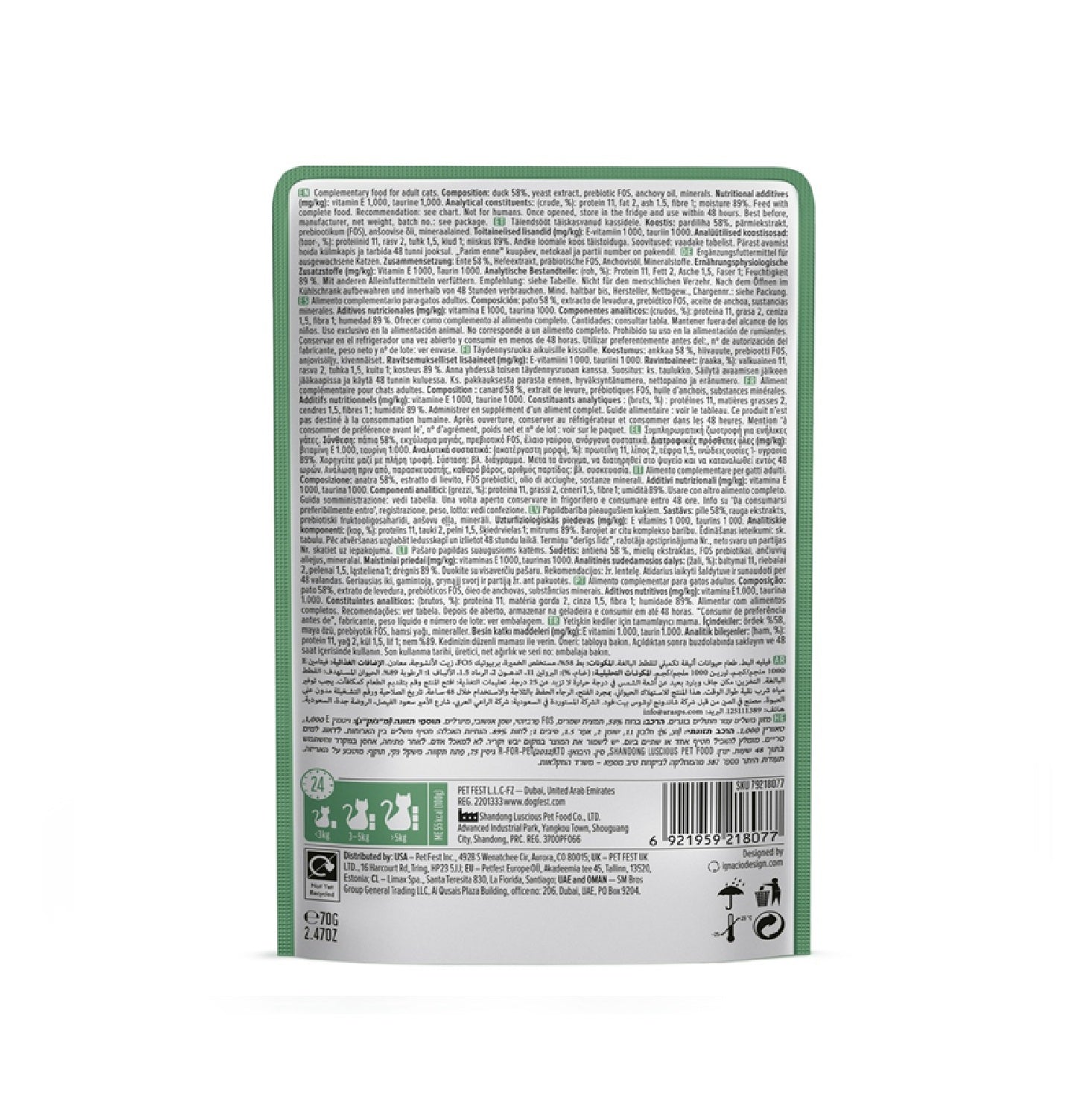 Feed with complete food. Up to 3 pouches per day. Serve at room temperature. Always have fresh water in a bowl. Shelf life 36 month if stored properly. Store in a cool and dry place. Best before date indicated on the package