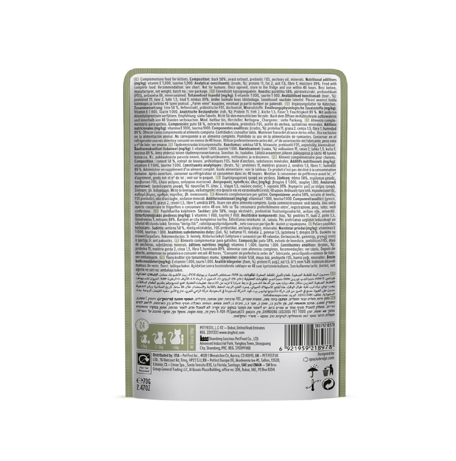 This specially formulated meal for kittens contains beneficial components such as duck, prebiotics, and anchovy oil, which help your pet grow healthy and full of energy. Natural ingredients and the tender texture of the food ensure balanced nutrition and support proper development. Served as a complementary feed.