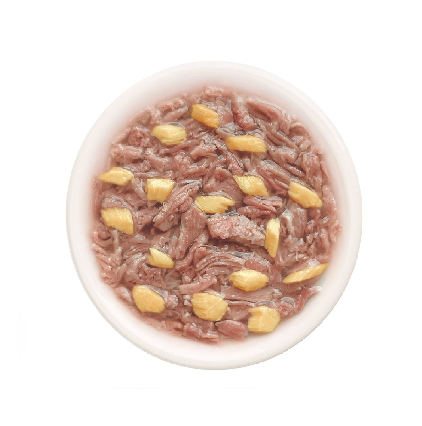 Duck 54 %, salmon 6 %,water 38 %, yeast extract 0.4 %, anchovy oil 0.1 %,carrageenan 0.7 %, guar gum 0.3 %, fructooligosaccharides 0.2 %, vitamin E 0.1 %, taurine 0.1 %, salt 0.1%