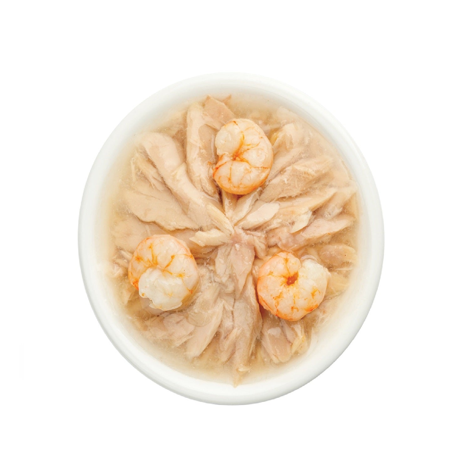 Tuna 54 %, shrimp 4 %,water 40 %, yeast extract 0.4 %, anchovy oil 0.1 %,carrageenan 0.7 %, guar gum 0.3 %, fructooligosaccharides 0.2 %, vitamin E 0.1 %, taurine 0.1 %,salt 0.1 %