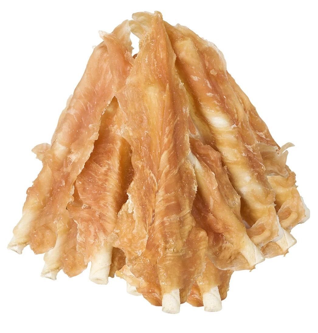 A rawhide stick covered with whole piece of chicken breast fillet. Let your dog have a great time chewing on a rawhide stick with the great taste of freshly cooked chicken.