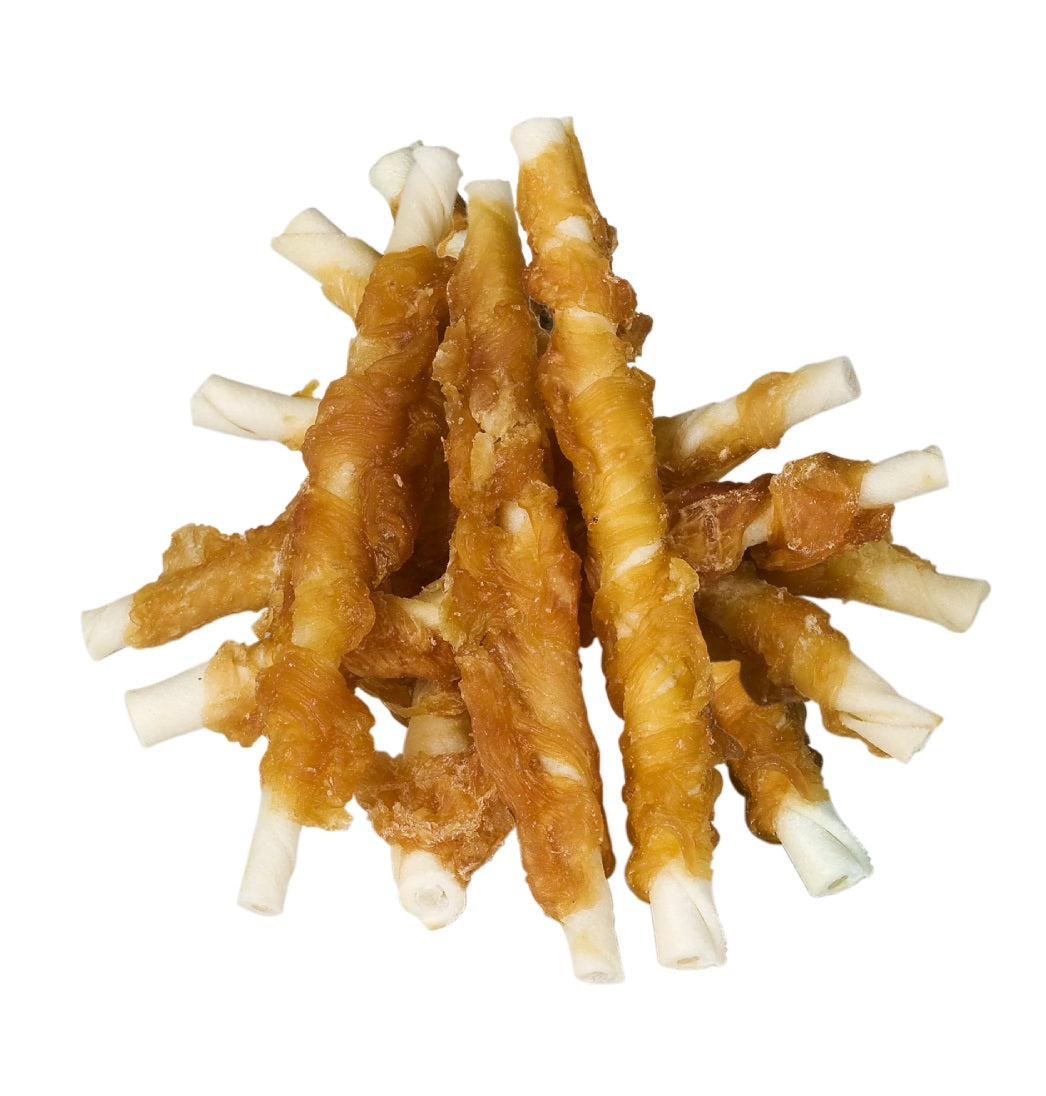 Simple and Classic. A long-lasting chewy rawhide stick is covered with strips of chicken breast fillet. Cooked in the oven to become one of the most favorite dog treats.