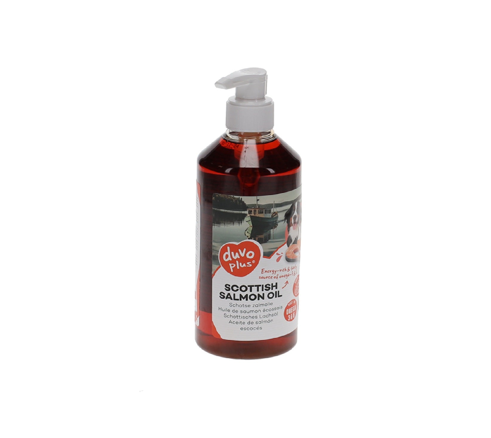 duvoplus salmon oil, sourced from sustainable fishing in Scotland, is a tasty high-energy food for dogs and cats. This natural product is packed with Omega-3 and Omega-6 fatty acids that have a beneficial effect on many different bodily functions. Salmon oil ensures a glossy coat, boosts digestion, keeps blood pressure and cholesterol low and supports joint mobility. It also has an anti-inflammatory effect which boosts your animal’s immune system. Use salmon oil to make food more palatable for picky dogs or cats.