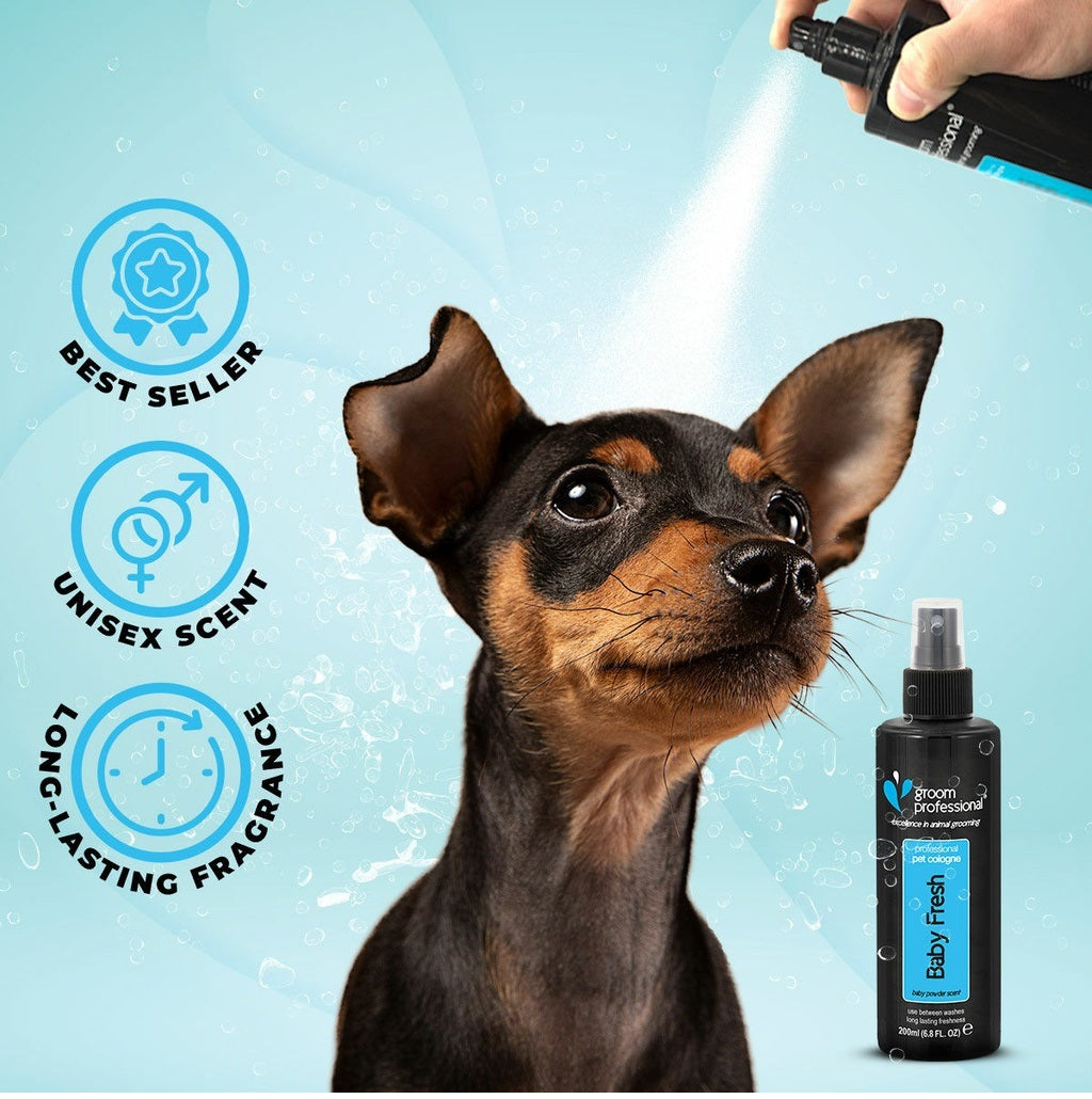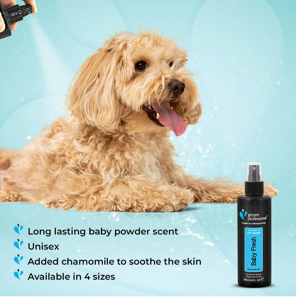 Do you want to give your pet a freshen up between washes, using that familiar baby powder scent we all know and love? The Baby Fresh cologne is by far one of the best sellers in the Groom Professional range and will have your pooch smelling fresh for days on end.