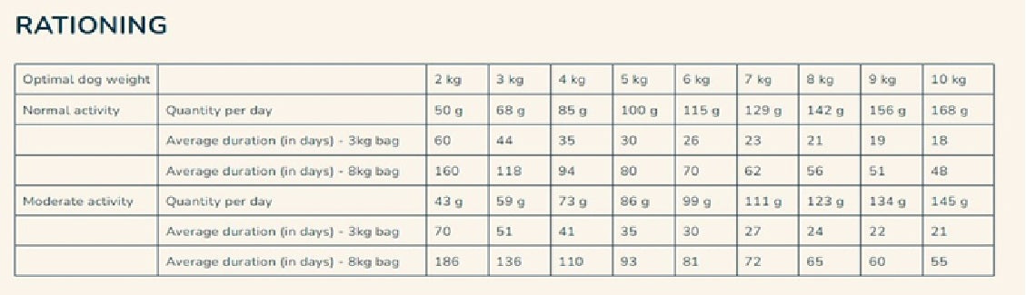High quality proteins, a source of essential amino acids, combined with an energy density that meets the needs of small dogs.