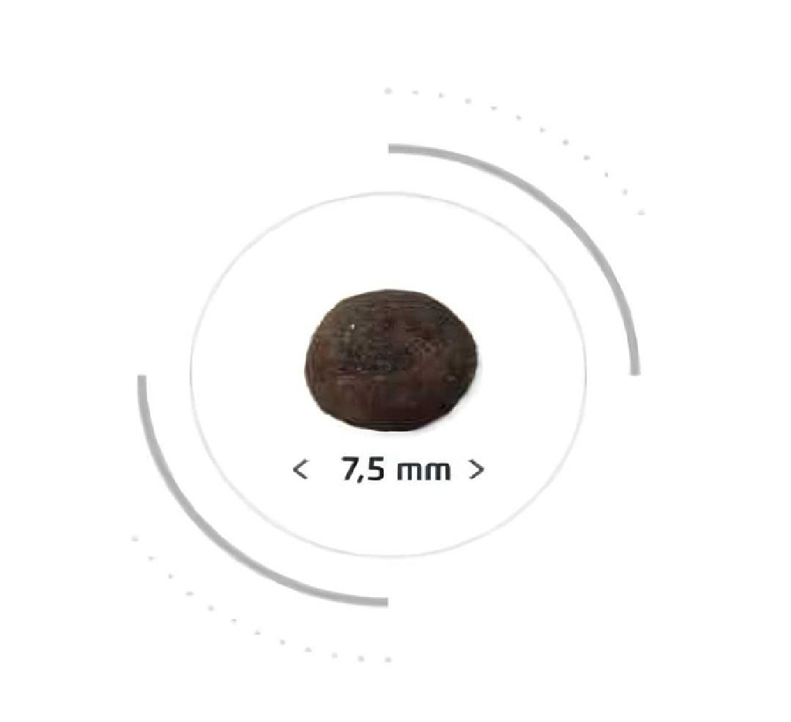 Dehydrated animal proteins 30% (poultry, pork). Corn. Rice (17%). Poultry fat. Linseed. Dehydrated fish (4%) Animal protein hydrolysates. Apple fibres. Egg (2%), Brewer's yeast. Potassium chloride. Fish oil (0.5%), Fish autolysates (0.4%) Sea salt. Calcium carbonate. Fructo-oligosaccharides. Yucca Yeast extracts (0.04%) (Saccharomyces cerevisiae, Ciberlindera Jadini), Enterococcus faecium (4b1707) (Probiotics) Vitamins and trace elements.