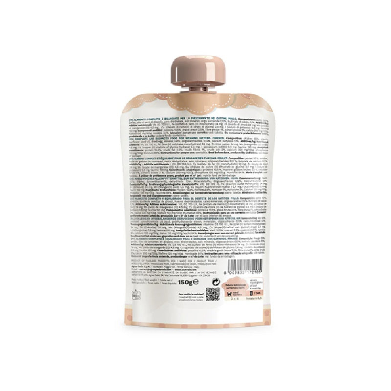 All our Kitten Care recipes are specifically formulated for kittens, the most natural way to care for your furry friend every day. A complete, balanced product formulated for kittens aged 0-6 months Chicken is the main ingredient in this recipe Added vitamins and minerals High protein content Ideal for development of the immune system Grain free Cruelty free New 150g “squeeze and dose” format, with resealable cap Recommended for kittens Supplement your kitten's diet with Schesir's complete wet and/or dry foods, for a balanced nutrition brimming with flavour and energy! Schesir’s natural Kitten line Take care of your furry baby in the most natural way with Schesir KITTEN CARE, our line of products specifically aimed at kittens. Two recipes containing the best cuts of tuna or chicken, steam-cooked and prepared by hand, for tasty nutrition from the very first months of life. The tuna we use comes exclusively from sustainable fisheries and is fully traceable: every package clearly indicates the species of tuna used in the batch.