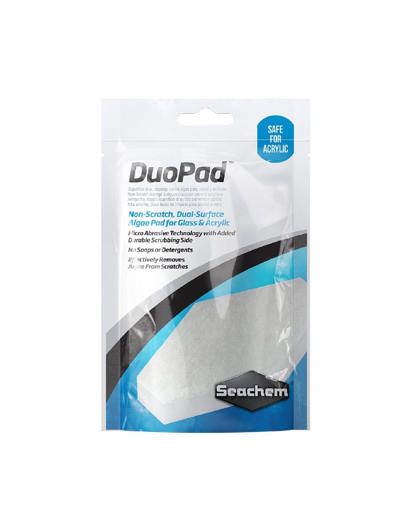 The Seachem DuoPad is a non-scratch, dual surface algae pad for glass and acrylic. The melamine foam side uses micro abrasive technology to easily remove algae from the sides of your aquarium, while the durable scrubbing side allows you to attack the rougher grooves of rocks and driftwood. It is particularly effective at removing algae from scratches. It is chemically inert and does not use soaps or detergents. It's white color contrasts against dark algae making it easier to see when areas are fully clean.