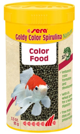 Sera Goldy Color Spirulina Nature is the color food consisting of gently manufactured granules without dyes and preservatives for bigger goldfish, fastidious fancy variants and other finicky Coldwater fish.