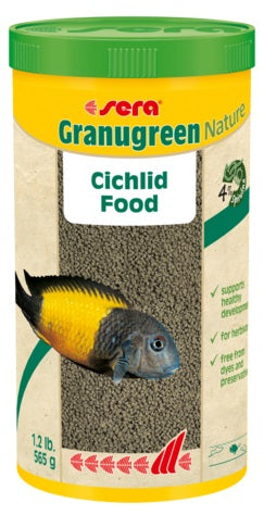 Staple food for East African cichlids sera Granugreen Nature is the staple food consisting of gently manufactured granules without dyes and preservatives for smaller cichlids that mainly eat plants and periphyto.