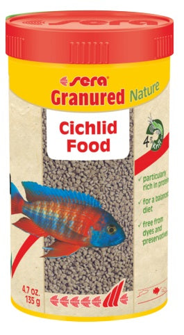 Sera Granured Nature is the staple food consisting of gently manufactured granules without dyes and preservatives for mainly carnivorous, smaller cichlids and omnivores.