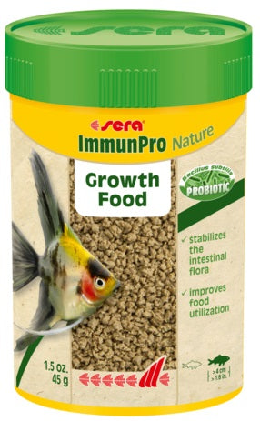 Sera ImmunPro Nature is the growth food for all ornamental fish above 4 cm (1.6 in.). The probiotics are applied to the food in a particularly gentle procedure and stabilize the intestinal flora of the ornamental fish. They ensure reduced water pollution because of more efficient food utilization. Due to the high protein percentage of more than 50%, the addition of probiotics and other functional ingredients such as MOS, Haematococcus (rich in natural astaxanthene) and Spirulina, the breeder food ensures quick growth, strong development and brilliant coloration of the fish.