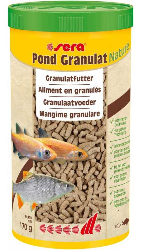 The granulated food for bigger pond fish easily digestible stable in water for a long time for lively, active pond fish sera Pond Granulat is the staple food consisting of carefully processed granules for all bigger pond fish such as Koi and big goldfish.