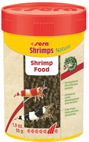 Shrimp food with spirulina and alder cones sera Shrimps Nature is the staple food consisting of gently manufactured granules without dyes and preservatives for all shrimps in fresh and marine water.