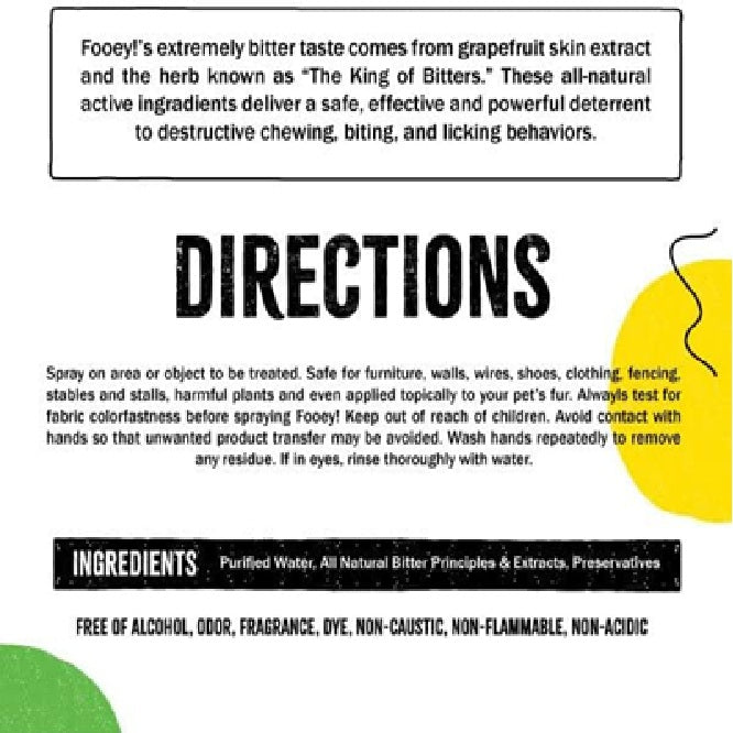 Fooey®! is so disgustingly bitter, we actually have a registered trademark to say it’s “the most bitter stuff on earth! ™” When used in conjunction with recommended training methods, Fooey®! stops dangerous and destructive behaviors such as unwanted chewing, licking, biting, ingesting and more.